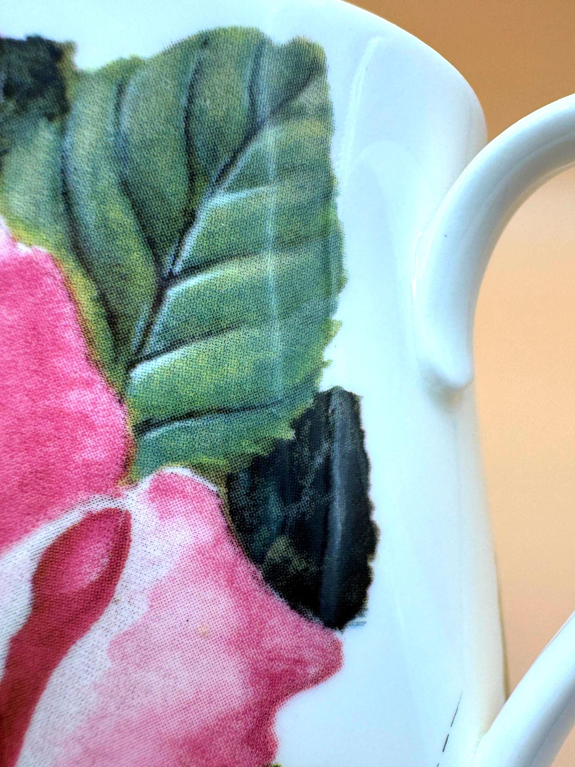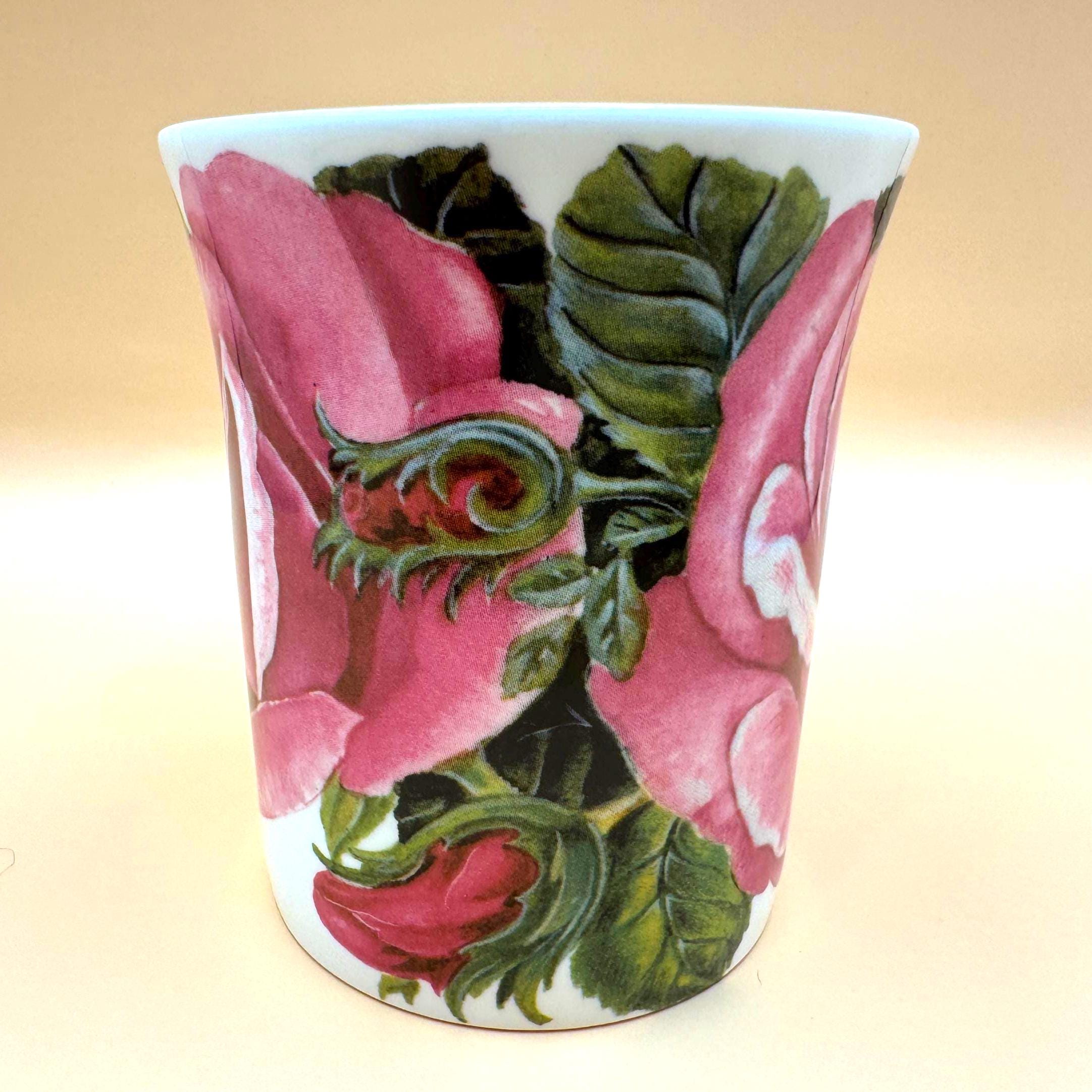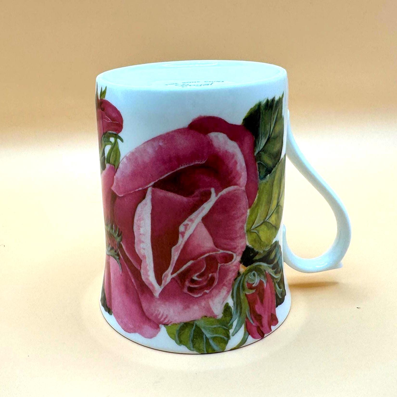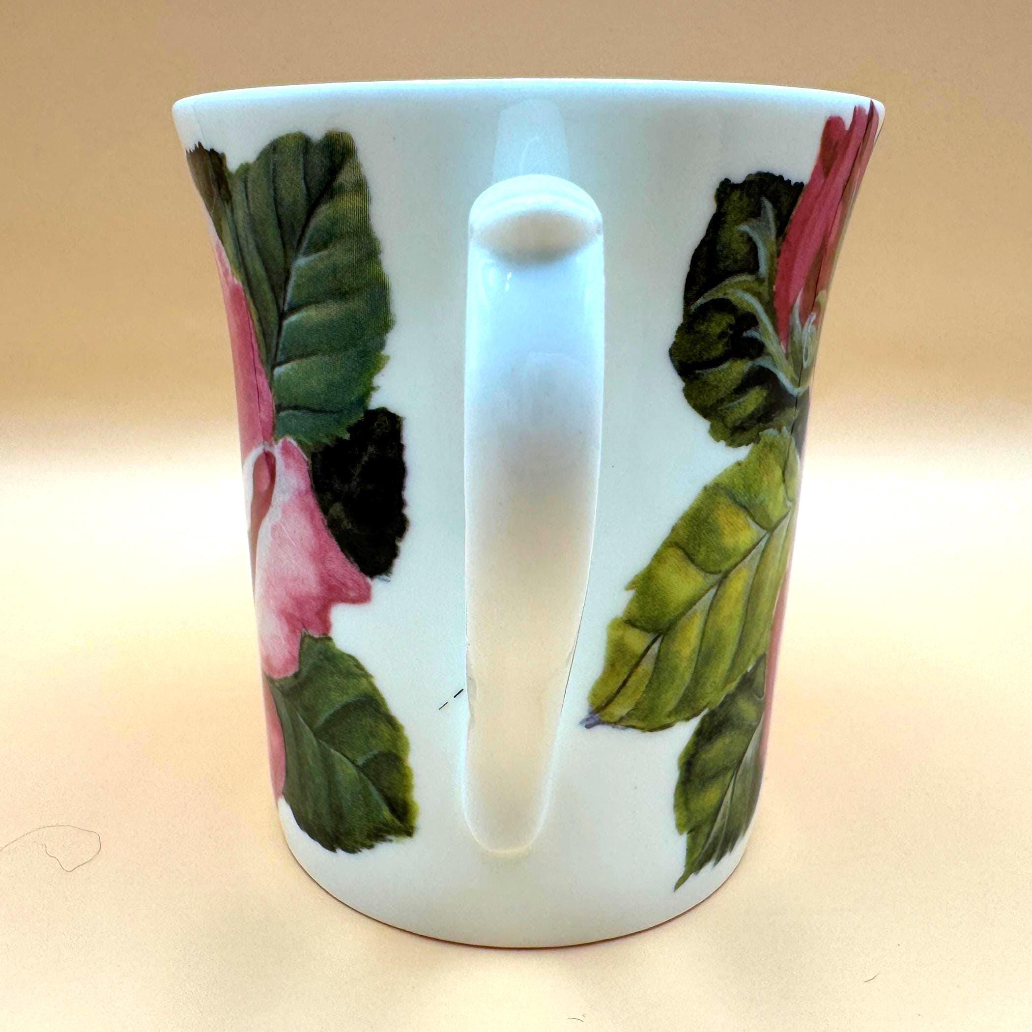 Elegant vintage English fine bone china mug by Royal Stuart, featuring a beautifully detailed pink rose design with rich green leaves. This classic floral mug has a gently flared shape and a smooth glossy finish, perfect for coffee, tea, or display.