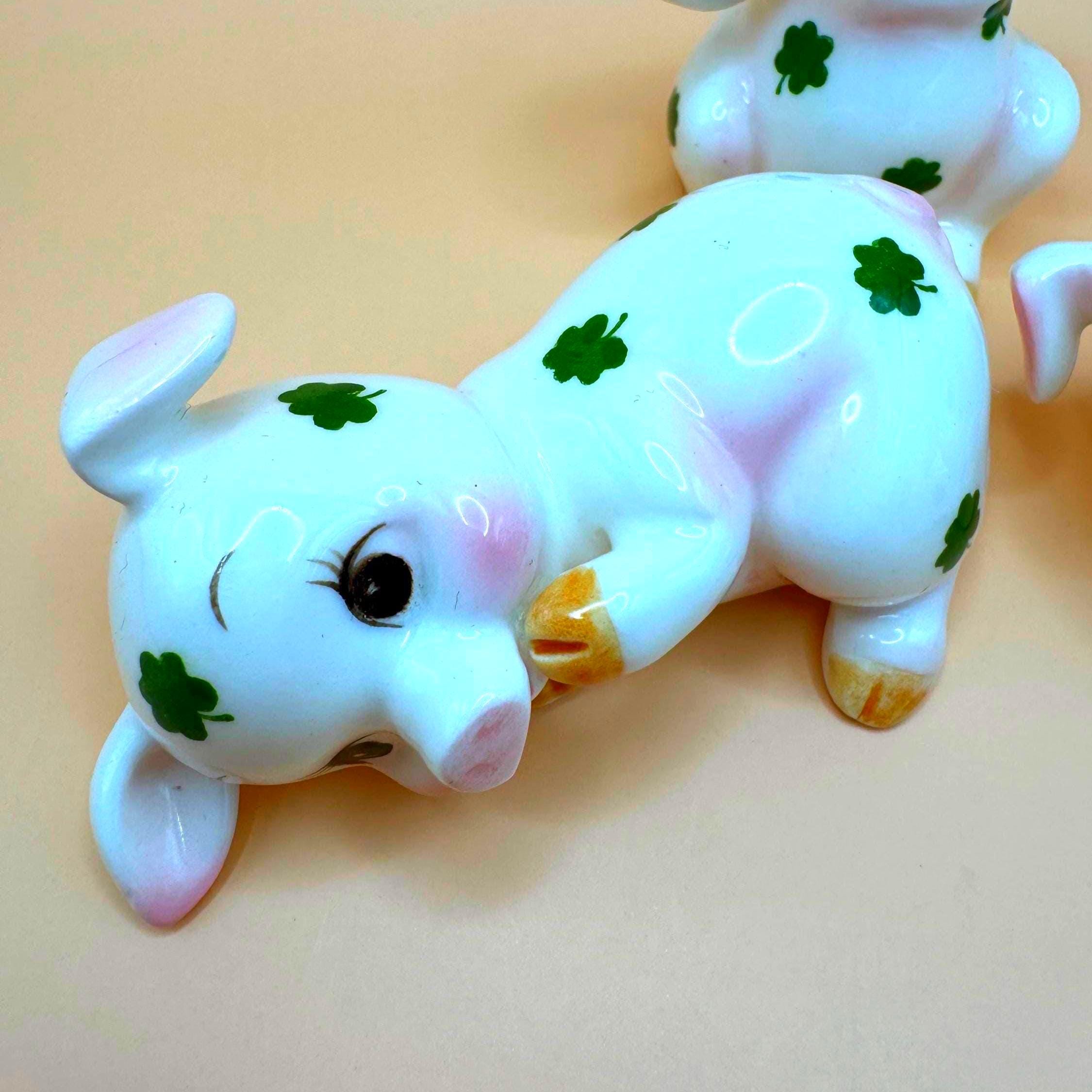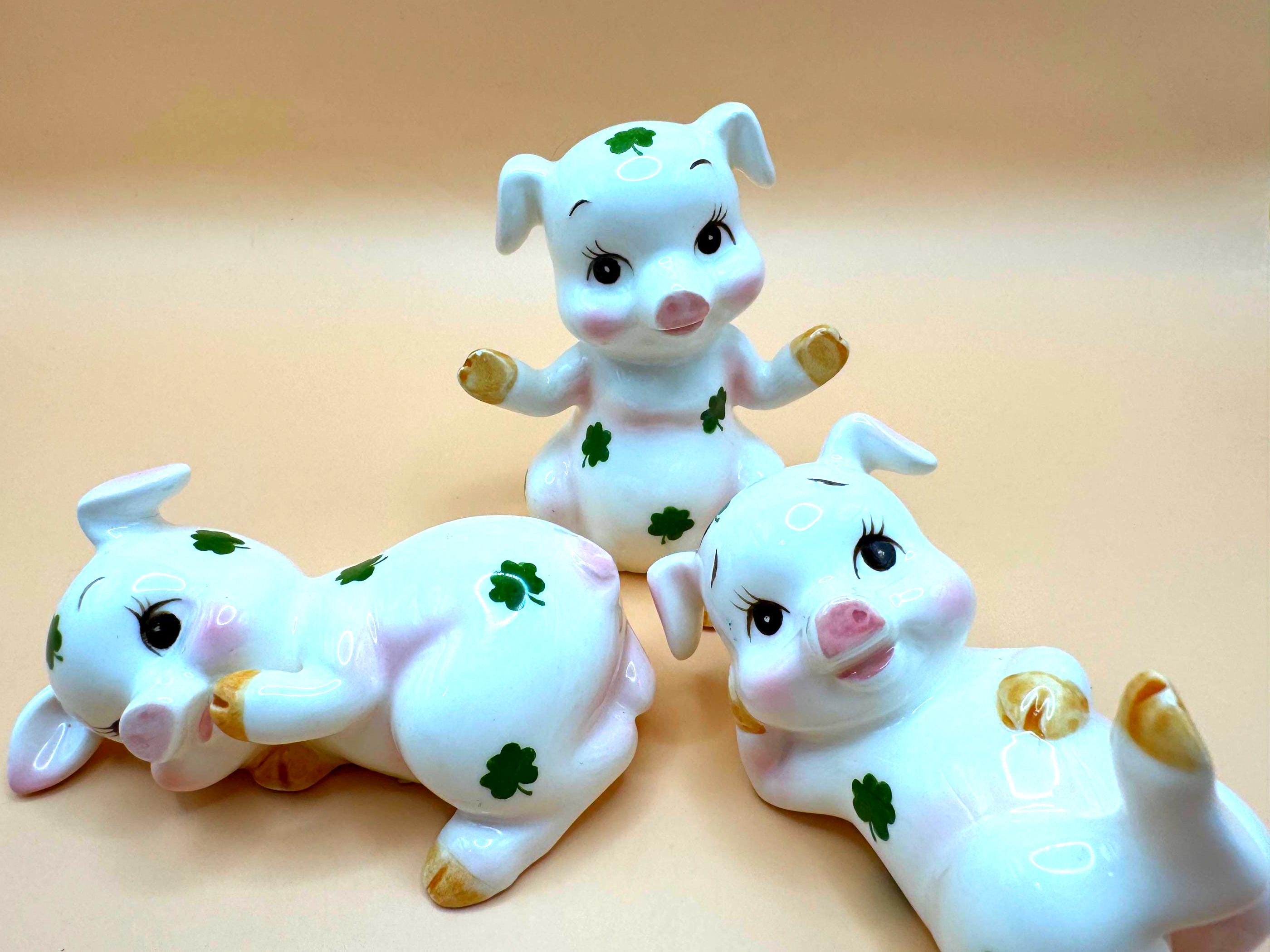 Charming vintage set of three ceramic pig figurines by Lefton, featuring sweet piglets decorated with green clovers for good luck. This playful trio includes three different poses, designed to be displayed together as a coordinated set.