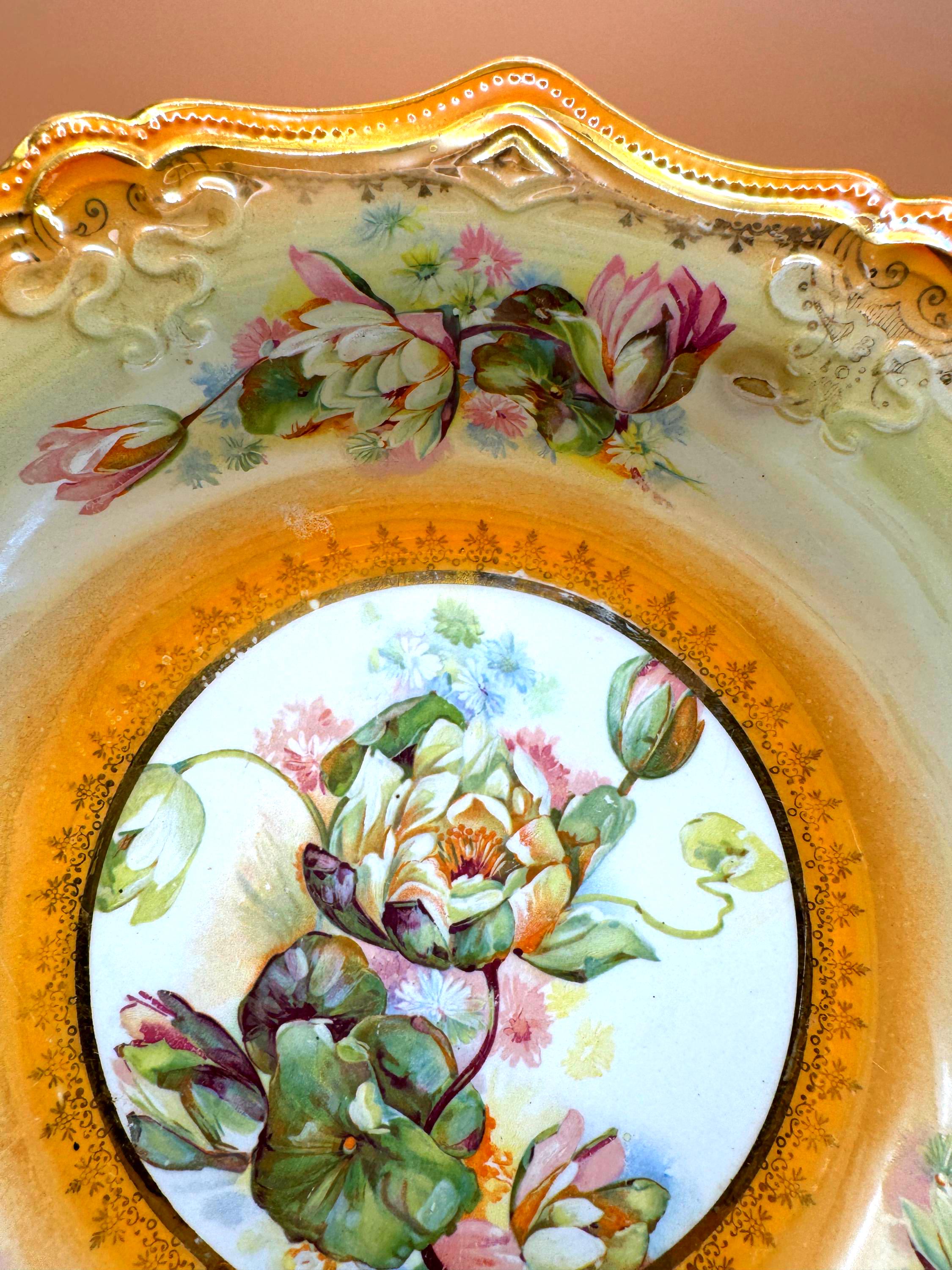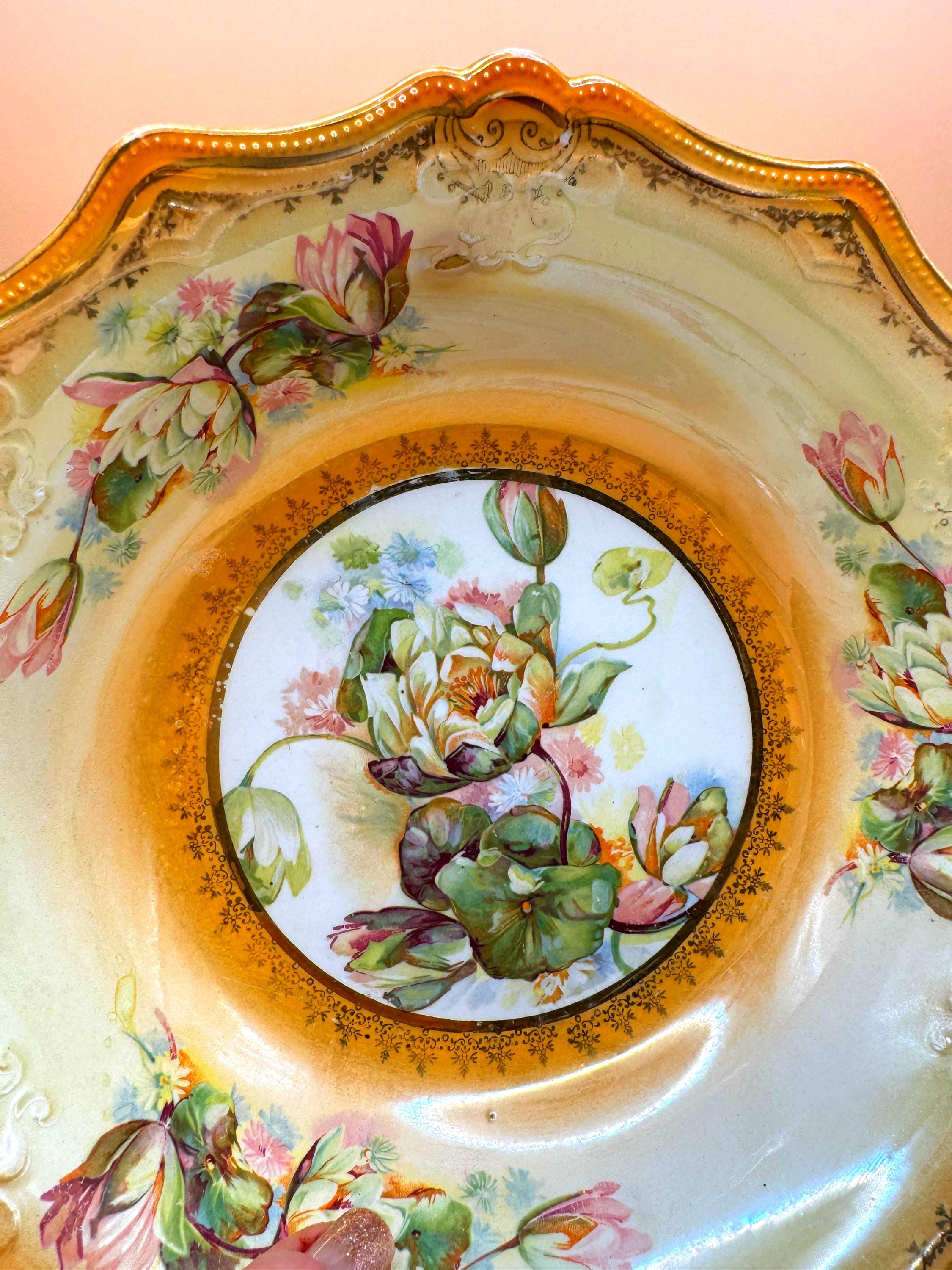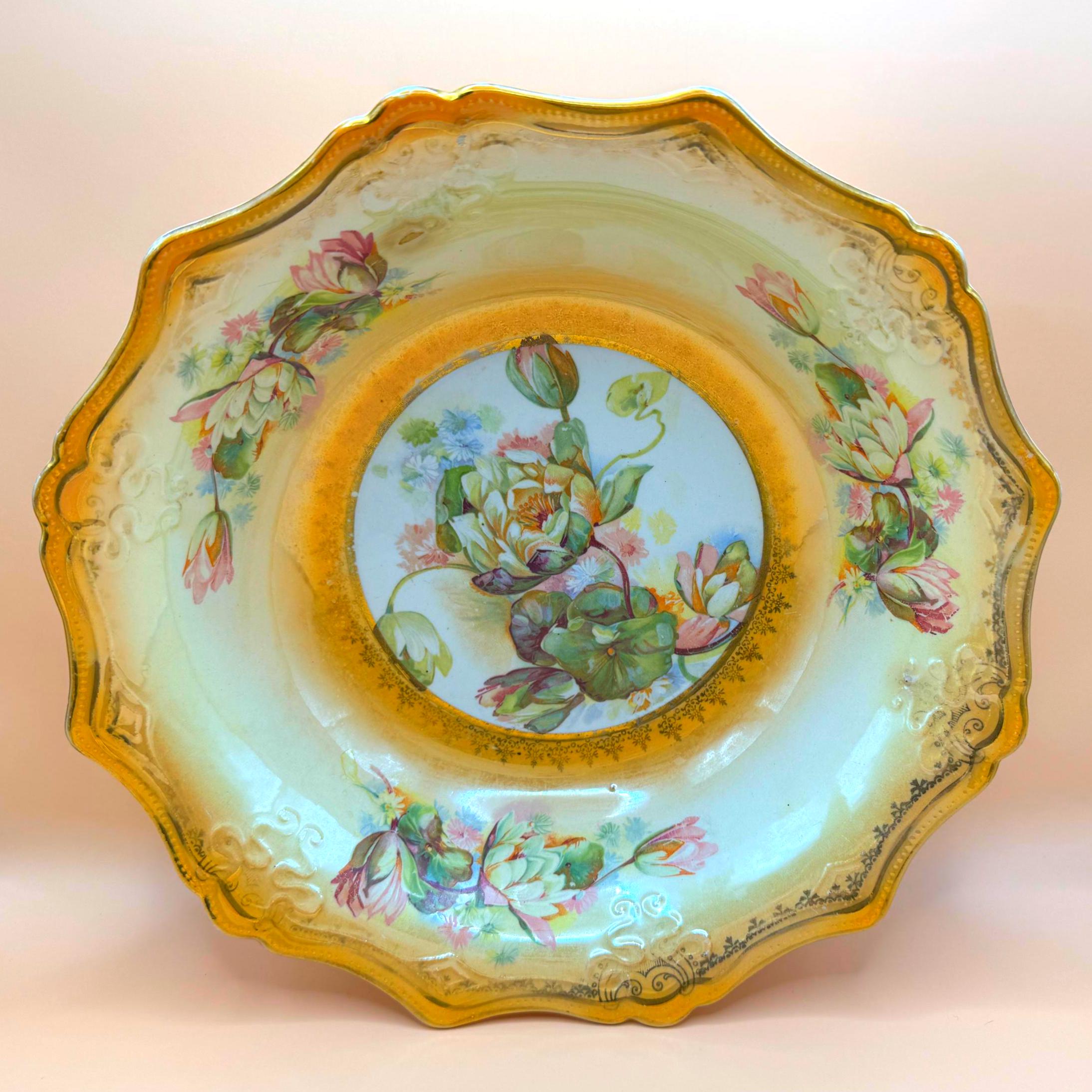 Elegant vintage porcelain display bowl featuring a richly decorated49.95 gold scalloped rim and a detailed water lily–style floral medallion at the center. Soft pastel florals, delicate buds, and ornate scrollwork give this piece a serene, romantic presence that displays beautifully in a china cabinet, hutch, or curated shelf.