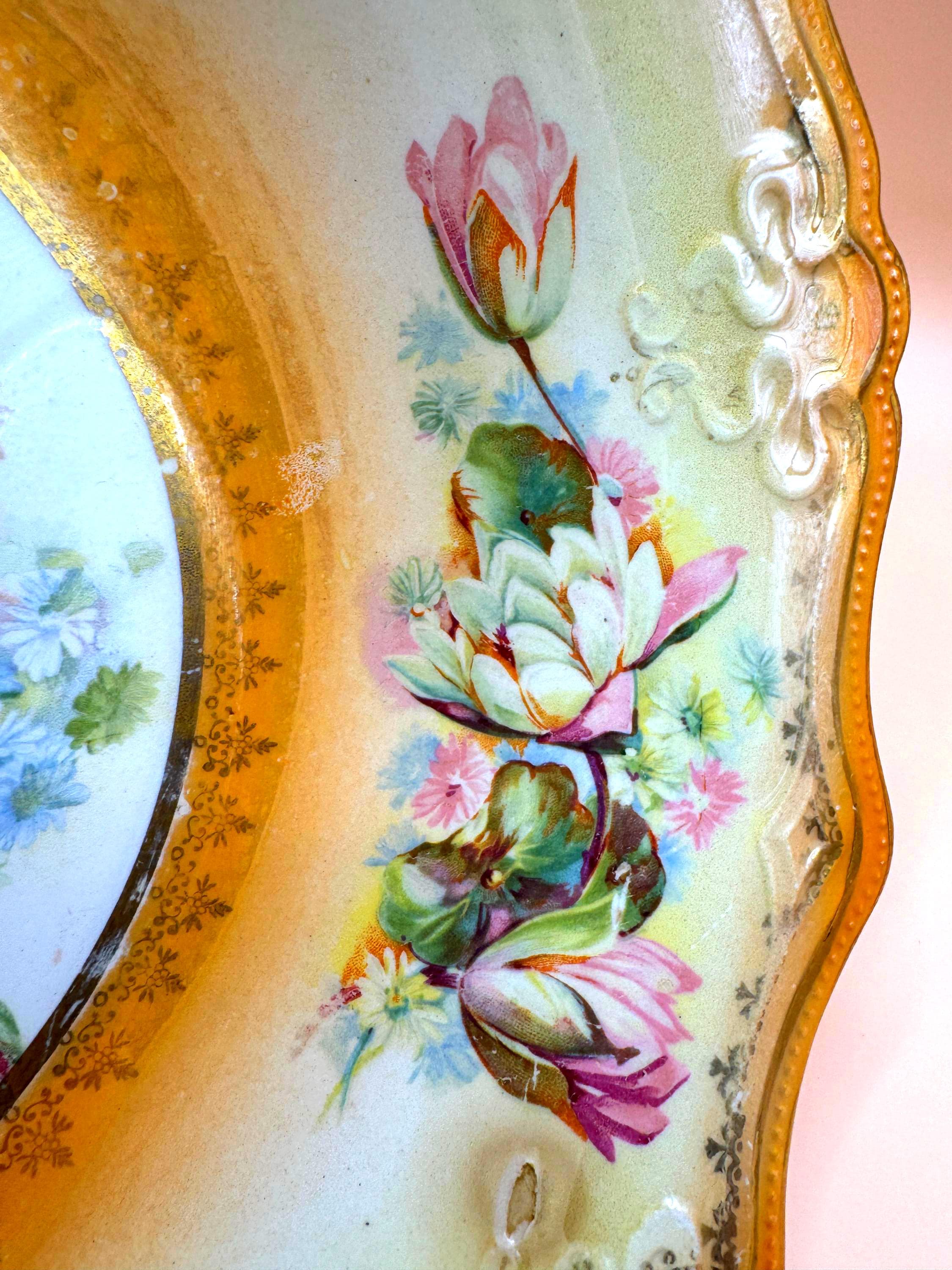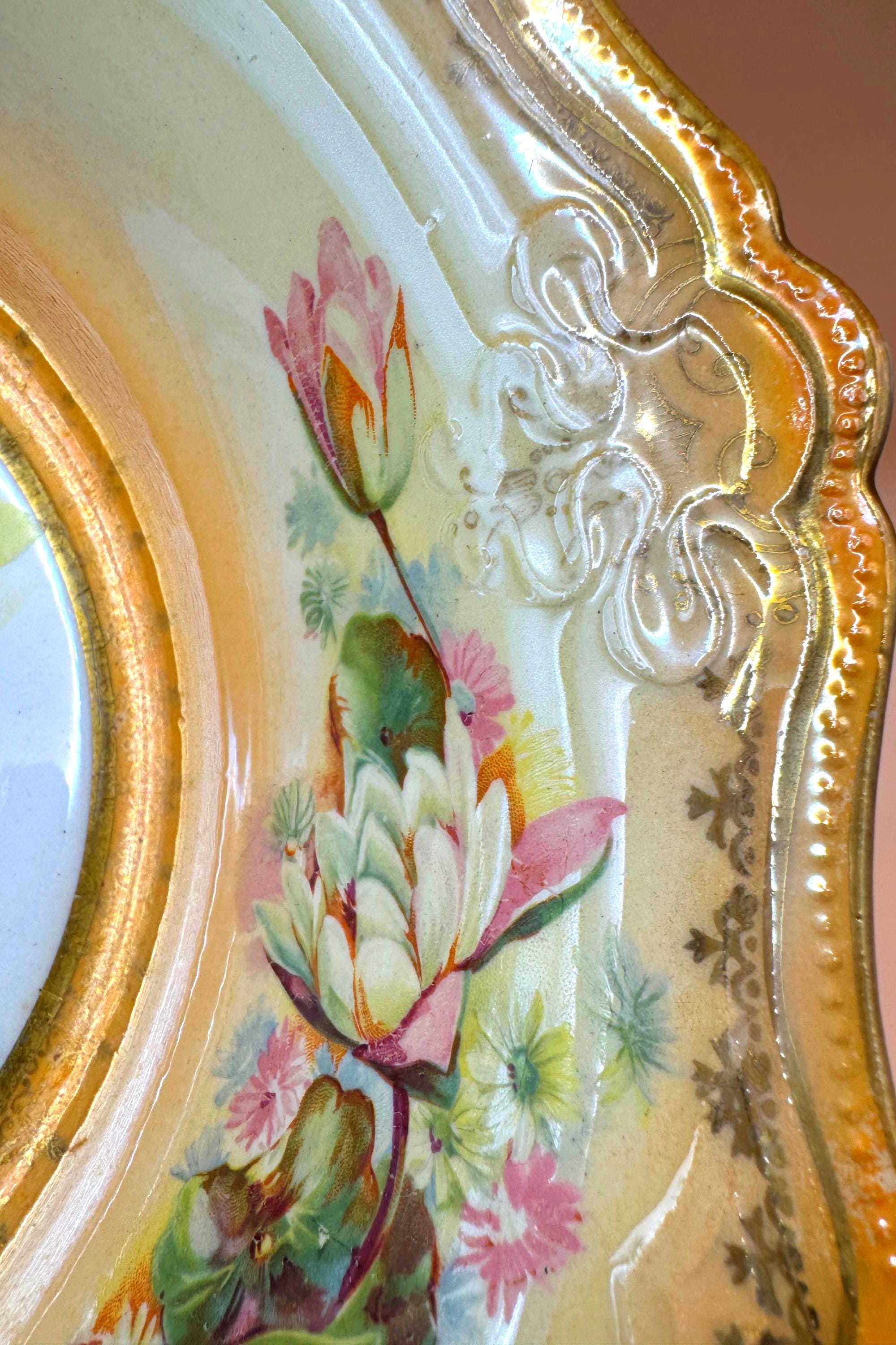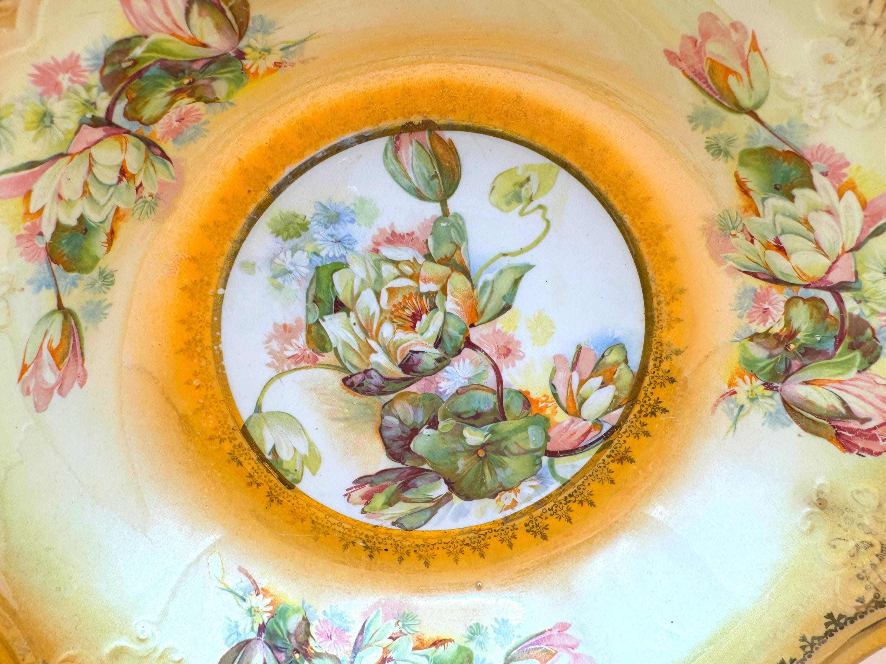 Elegant vintage porcelain display bowl featuring a richly decorated49.95 gold scalloped rim and a detailed water lily–style floral medallion at the center. Soft pastel florals, delicate buds, and ornate scrollwork give this piece a serene, romantic presence that displays beautifully in a china cabinet, hutch, or curated shelf.