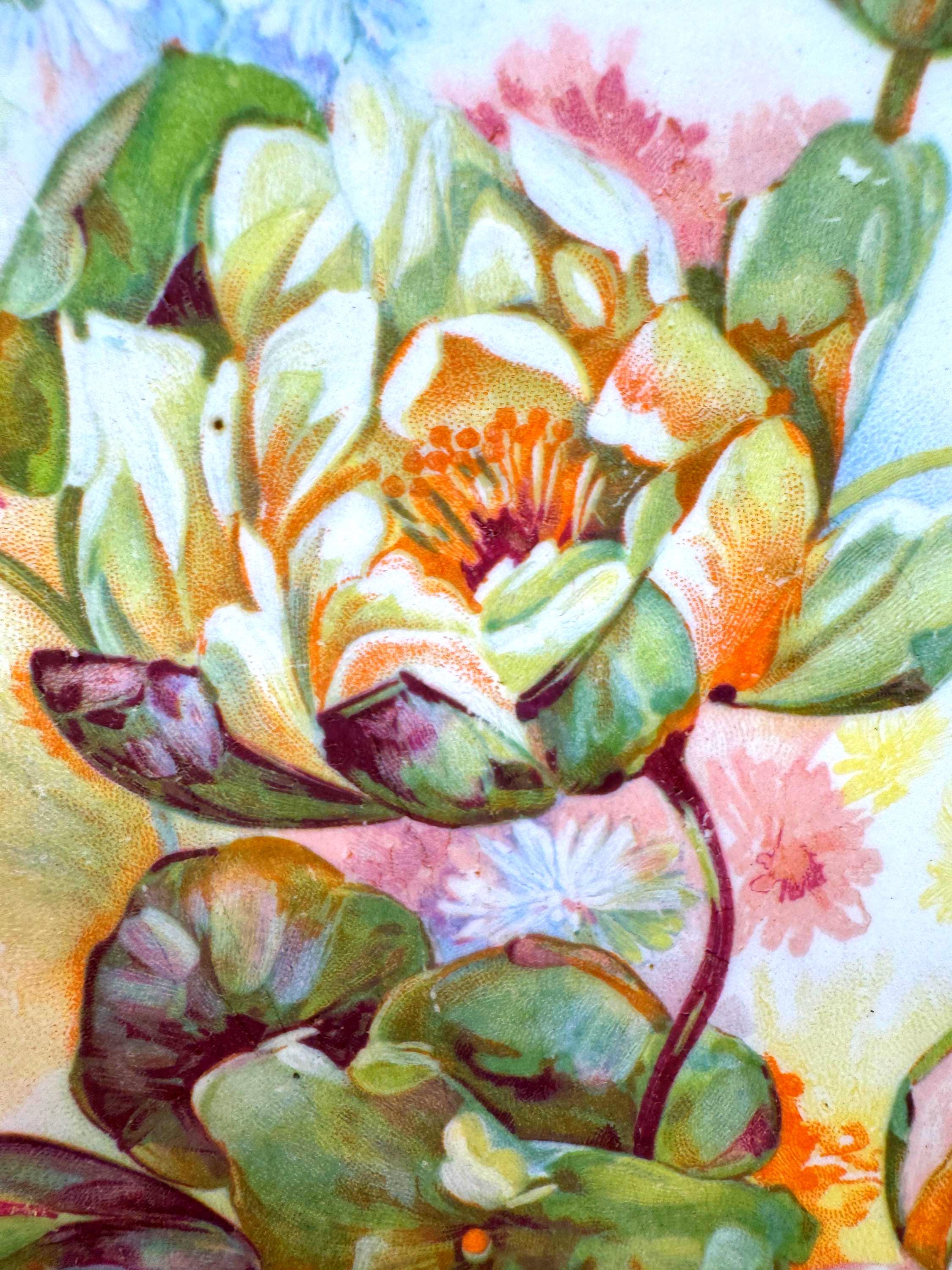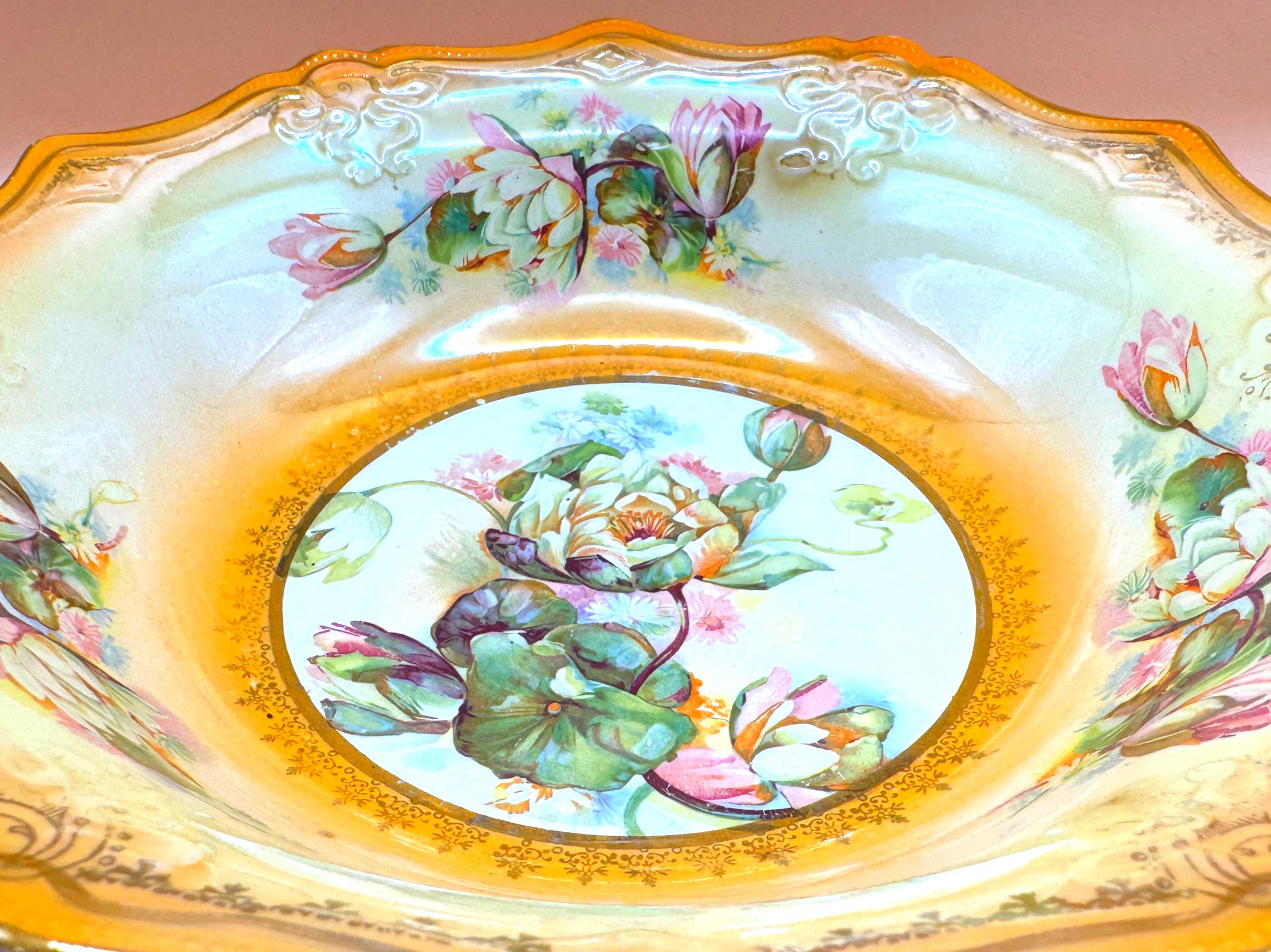 The water lily motif—commonly used in mid-century decorative porcelain—adds a sense of calm and refinement, while the gold shading and embossed details reflect quality craftsmanship typical of the 1940s–1950s. This bowl was originally designed to be both beautiful and functional, but today it is most often enjoyed as a decorative accent.