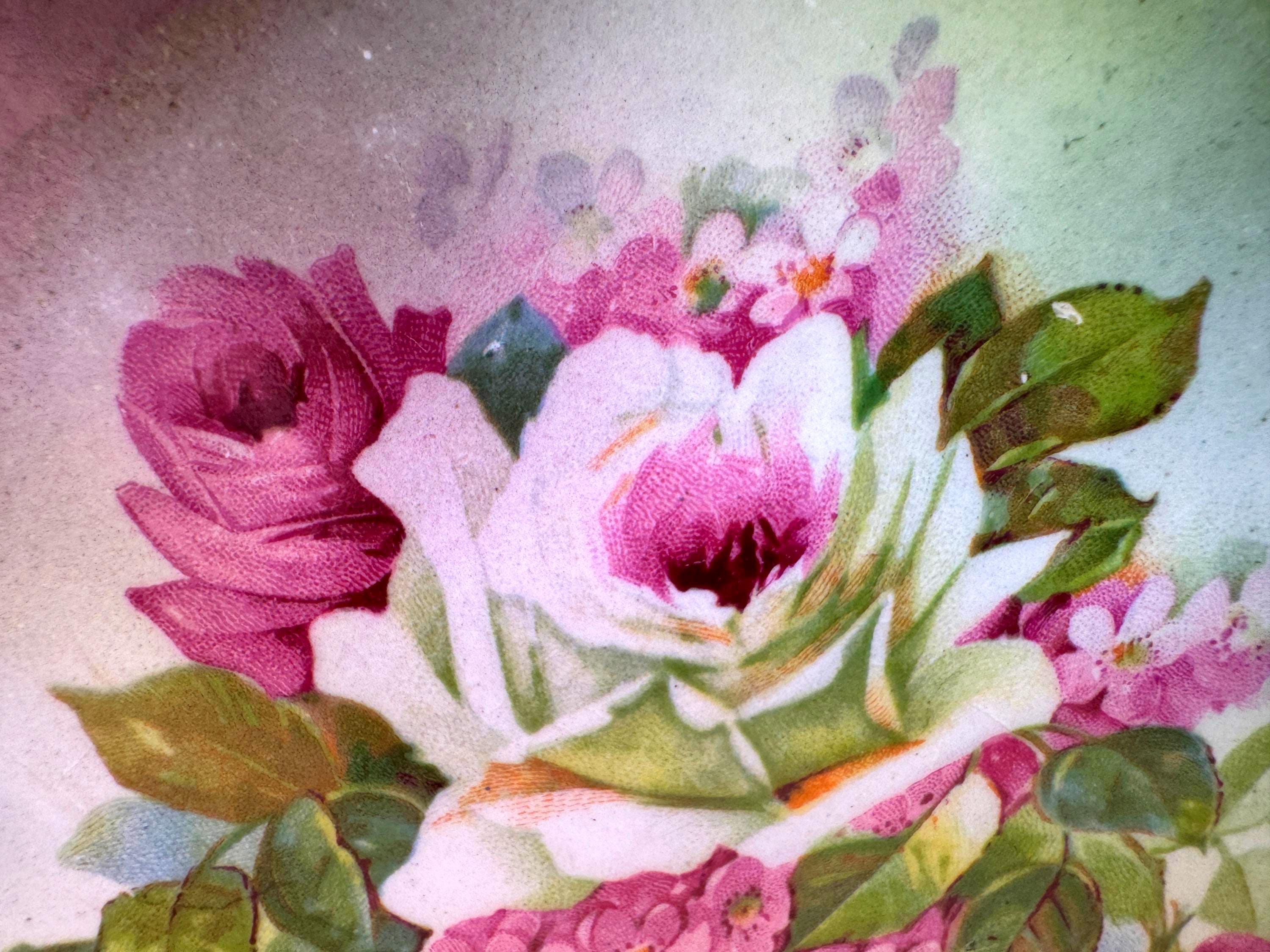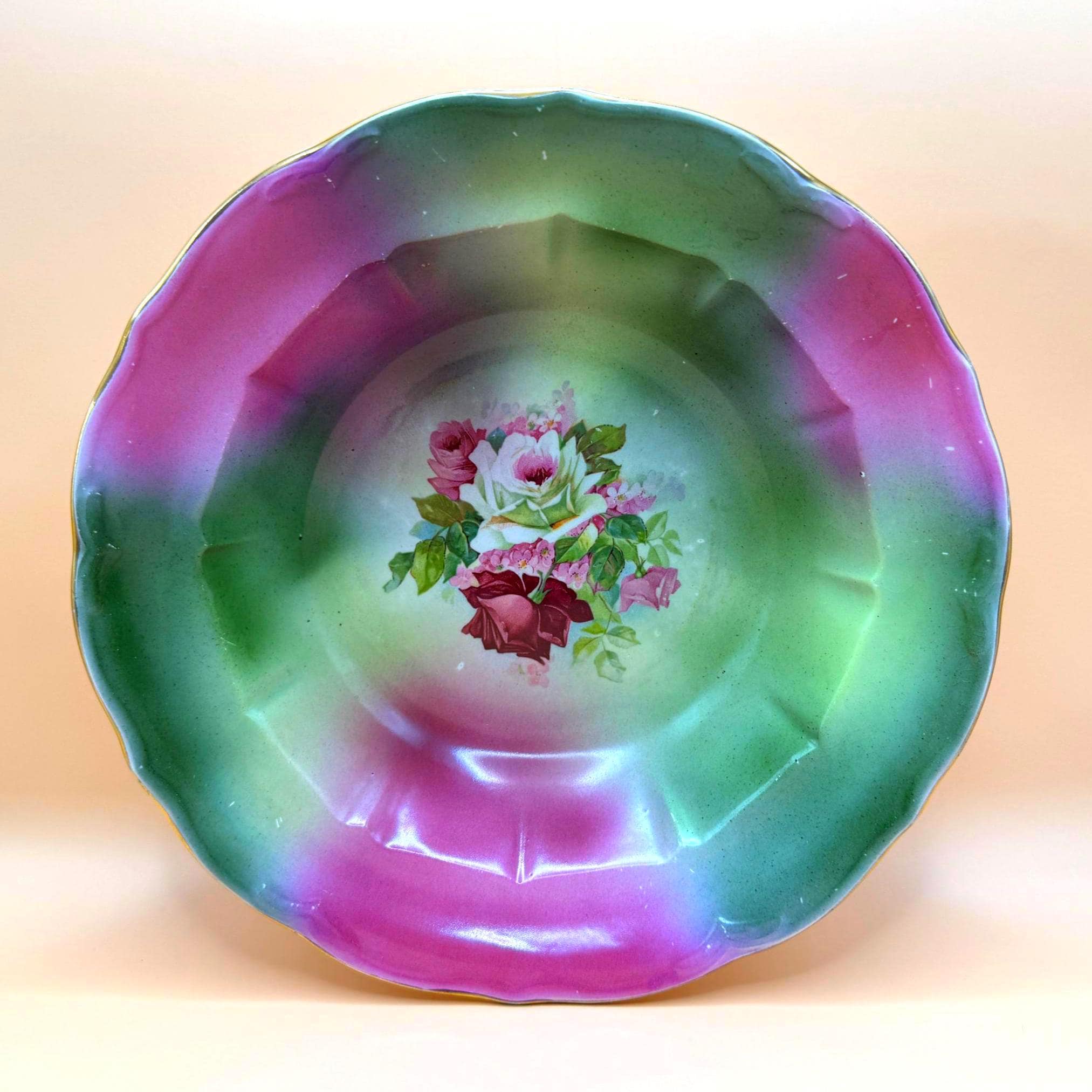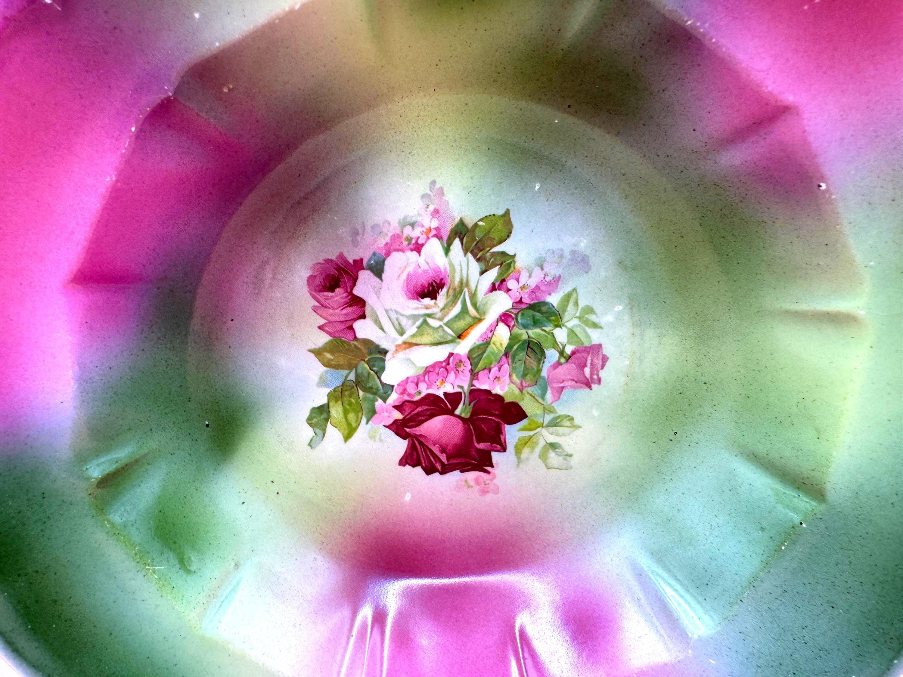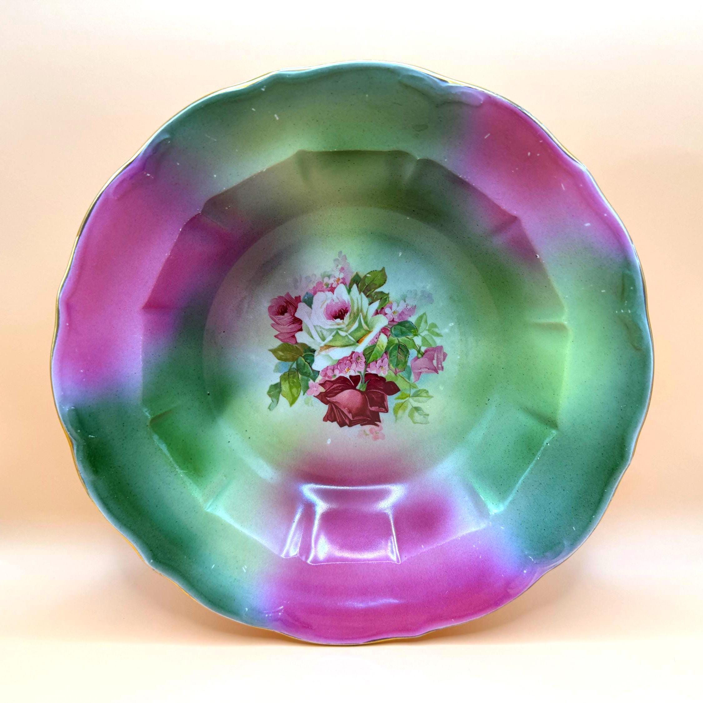 Beautiful vintage mid-century porcelain display bowl decorated by H. R. Wyllie & Co.. This piece features soft green and fuchsia/purple airbrushed shading with a detailed rose bouquet transfer at the center. The scalloped rim and faceted interior give the bowl depth and visual interest, making it an elegant decorative accent.